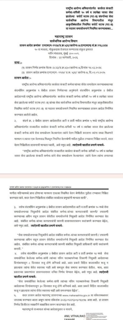 सदर शासन निर्णयानुसार नमूद करण्यात आले आहे की , आरोग्य विभाग अंतर्गत कंत्राटी कर्मचाऱ्यांपैकी 10 वर्ष व त्यापेक्षा जास्त सेवा झालेल्या सपोर्ट स्टाफ यांच्या सेवा सार्वजनिक आरोग्य विभागातील मंजूर आकृतीबंधातील नियमित सपोर्ट स्टाफ या पदावर समायोजनाने नियमित करण्याबाबत शासन आदेश निर्गमित करण्यात आलेला आहे .