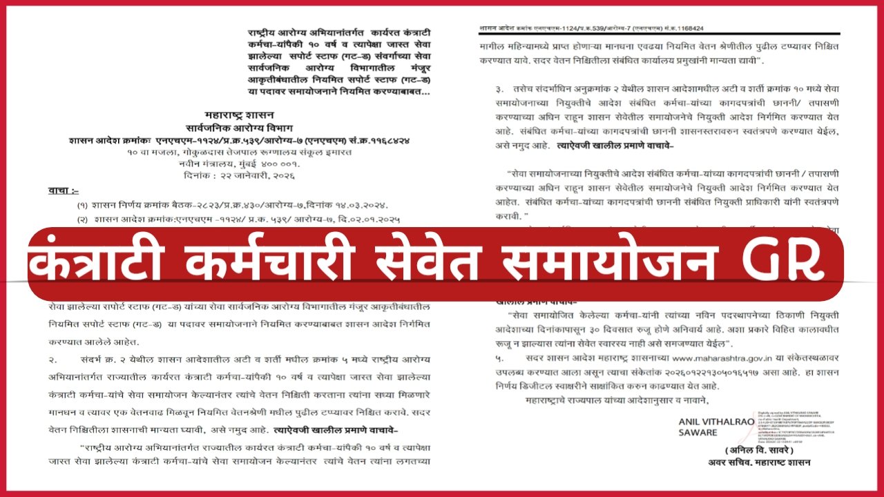 सदर शासन निर्णयानुसार नमूद करण्यात आले आहे की , आरोग्य विभाग अंतर्गत कंत्राटी कर्मचाऱ्यांपैकी 10 वर्ष व त्यापेक्षा जास्त सेवा झालेल्या सपोर्ट स्टाफ यांच्या सेवा सार्वजनिक आरोग्य विभागातील मंजूर आकृतीबंधातील नियमित सपोर्ट स्टाफ या पदावर समायोजनाने नियमित करण्याबाबत शासन आदेश निर्गमित करण्यात आलेला आहे .