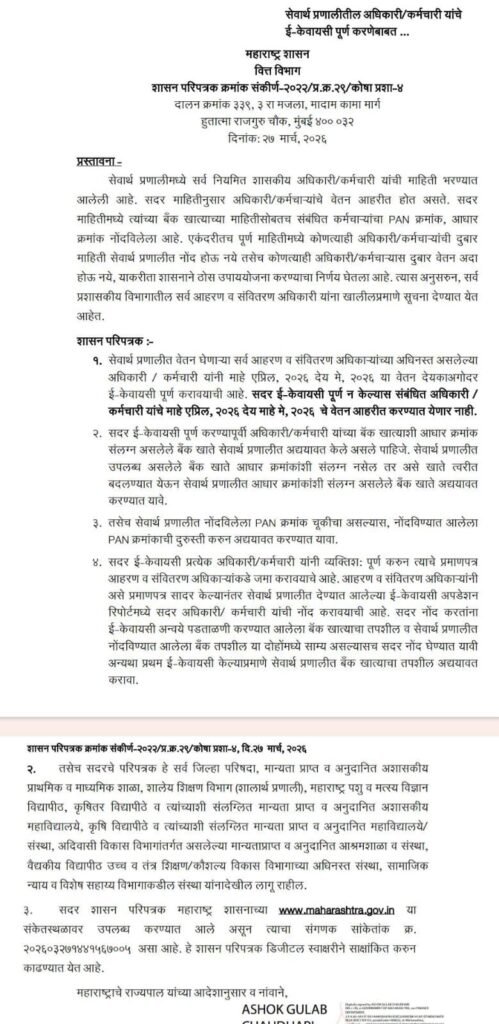 सदर निर्णयानुसार नमुद करण्यात आला आहे कि , सेवार्थ प्रणालीत वेतन घेणाऱ्या सर्व आहरण व संवितरण अधिकाऱ्यांच्या अधिनस्त असणाऱ्या अधिकारी / कर्मचारी यांचे माहे एप्रिल 2026 देय मे 2026 या वेतन देयक अदा करण्यापुर्वी ई – केवायसी पुर्ण करण्याचे निर्देश देण्यात आले आहेत .