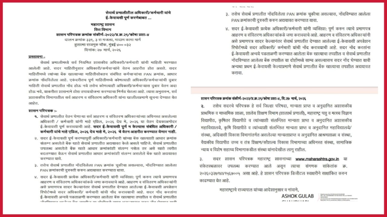 तसेच सदर ई – केवायसी पुर्ण न केल्यास , सबंधित अधिकारी / कर्मचाऱ्यांचे माहे एप्रिल 2026 देय माहे मे 2026 चे वेतन आहरित करण्यात येणान नसल्याचे स्पष्ट नमुद करण्यात आले आहेत . सदर ई – केवायसी पुर्ण करण्यापुर्वी अधिकारी / कर्मचारी यांच्या बँक खात्याशी आधार क्रमांक संलग्न असलेले बँक खाते सेवार्थ प्रणालीत अद्ययावत करणे आवश्यक असणार आहे .
