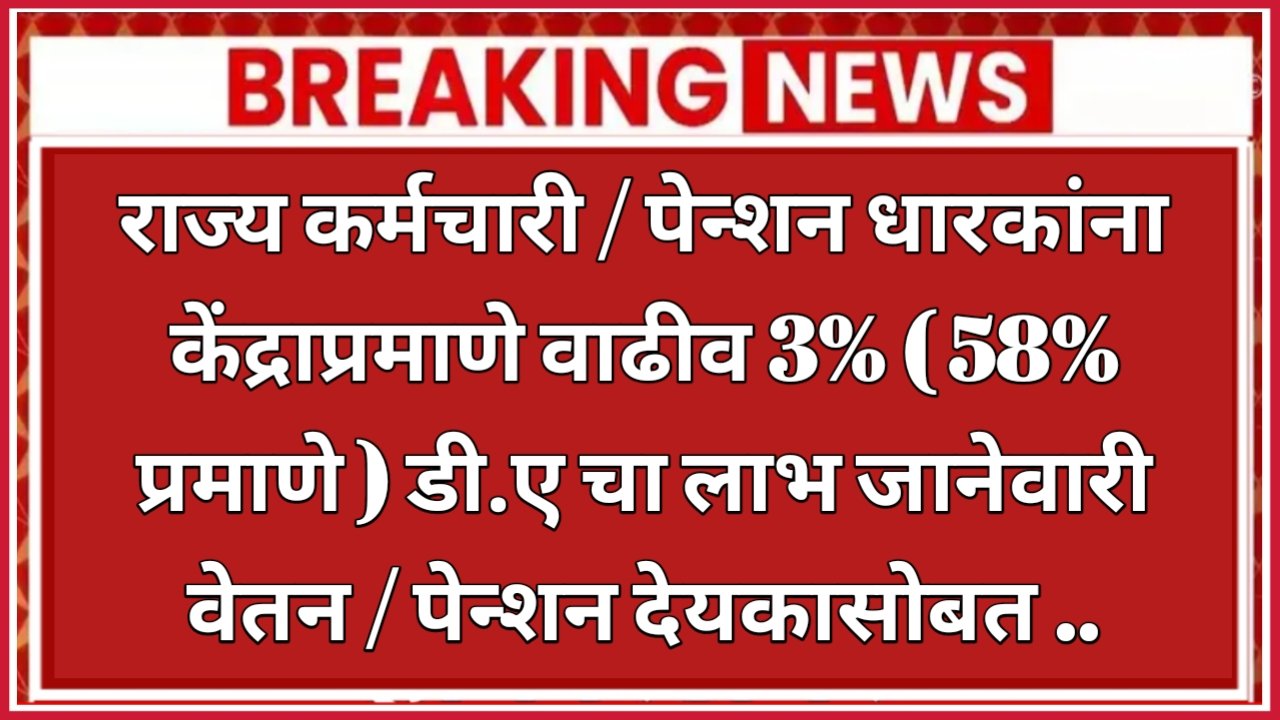 - राज्य कर्मचारी / पेन्शन धारकांना केंद्राप्रमाणे वाढीव 3% ( 58% प्रमाणे ) डी.ए चा लाभ जानेवारी वेतन / पेन्शन देयकासोबत ..