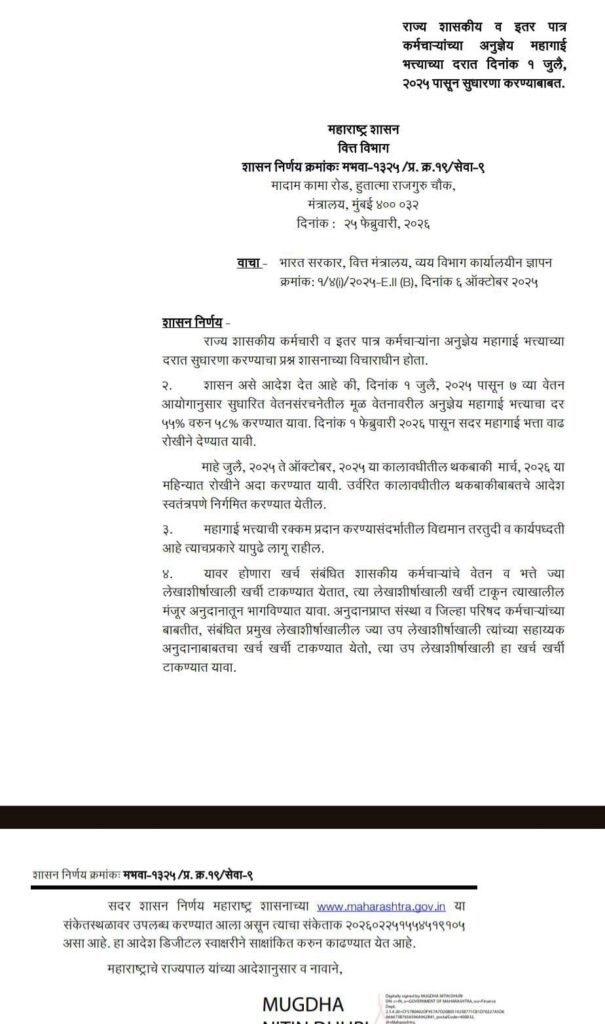 सदर महागाई भत्ता वाढ ही दि.01.02.2026 पासुन प्रत्यक्ष वेतनासोबत अदा करण्याचे निर्देश देण्यात आले आहेत .
