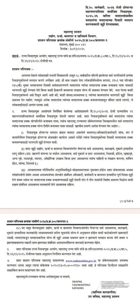 सदर शासन निर्णयानुसार 18 वर्षावरील नोंदणी झालेल्या सर्व नागरिकांनी प्रत्येक निवडणुकीमध्ये मतदान करणे अपेक्षित आहे , याकरीता दि.15 जानेवारी रेाजी होणाऱ्या राज्यातील 29 महानगरपालिका निवडणुकीकरीता सदर मतदारांना 15 जानेवारी रोजी भरपगारी सुट्टी किंवा काही तासांची सवलत देण्याचे निर्देश देण्यात आले आहेत .