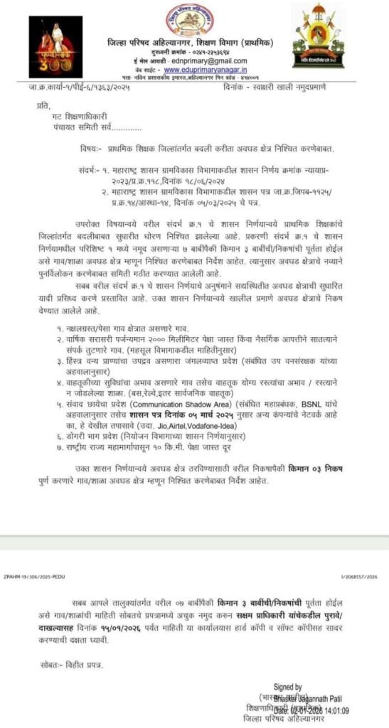 @marathipepar संगीता पवार प्रतिनिधी [ Revised criteria for determining difficult areas for intra-district transfers ] : जिल्हा अंतर्गत बदली करिता अवघड क्षेत्र निश्चित करणे संदर्भात सुधारित निकष जारी करण्यात आले आहे . या संदर्भात जिल्हा परिषद अहिल्यानगर यांच्यामार्फत दिनांक 2 जानेवारी 2026 रोजी सुधारित परिपत्रक निर्गमित करण्यात आले आहे .