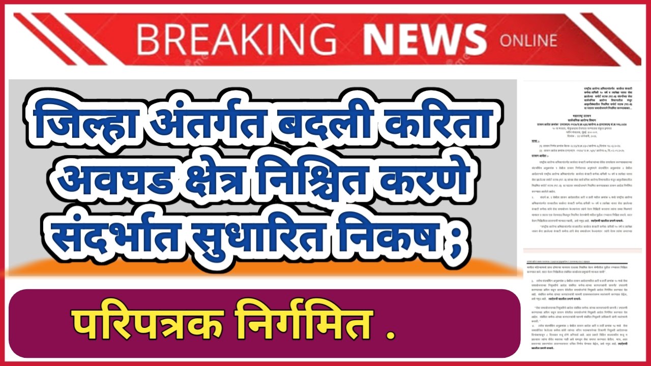 @marathipepar संगीता पवार प्रतिनिधी [ Revised criteria for determining difficult areas for intra-district transfers ] : जिल्हा अंतर्गत बदली करिता अवघड क्षेत्र निश्चित करणे संदर्भात सुधारित निकष जारी करण्यात आले आहे . या संदर्भात जिल्हा परिषद अहिल्यानगर यांच्यामार्फत दिनांक 2 जानेवारी 2026 रोजी सुधारित परिपत्रक निर्गमित करण्यात आले आहे .