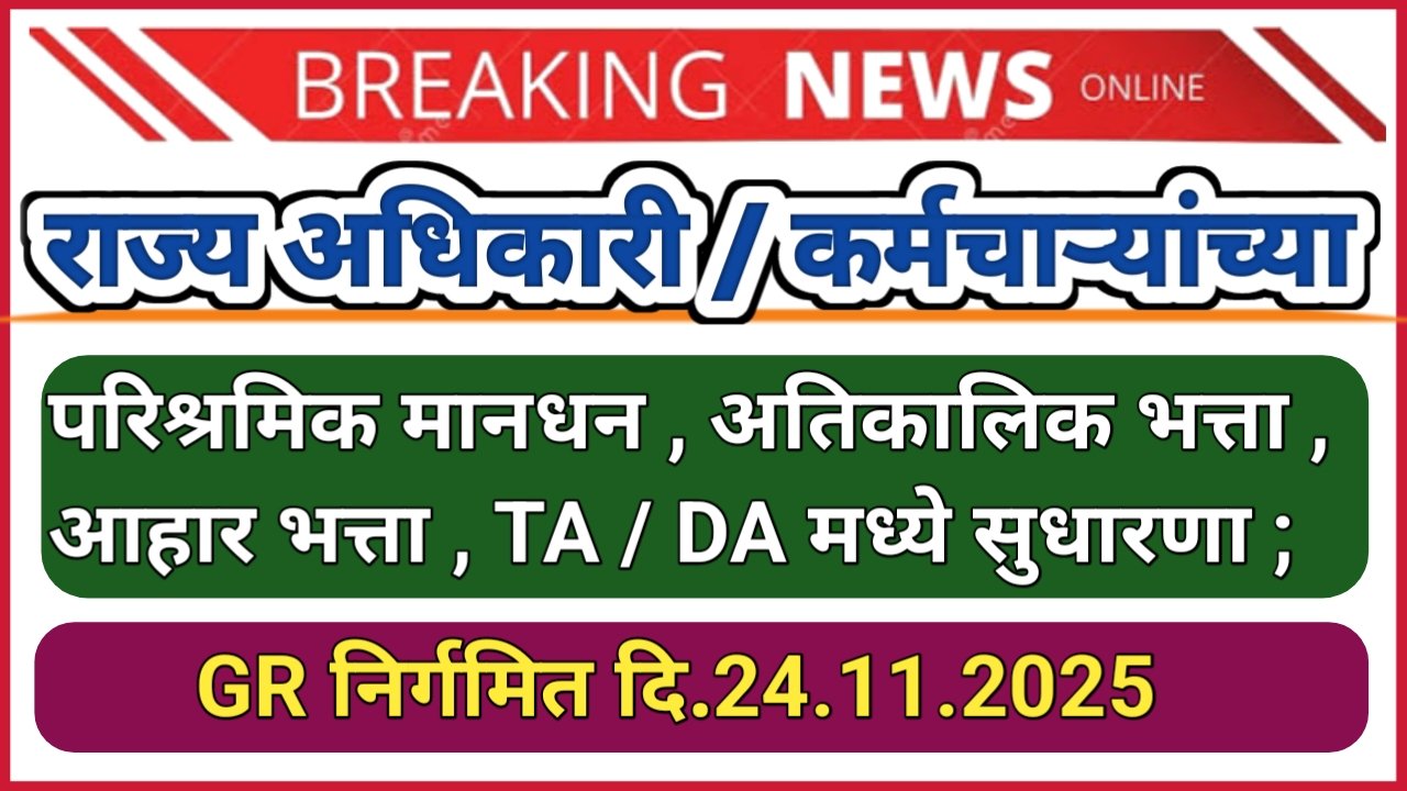 राज्य अधिकारी / कर्मचाऱ्यांच्या परिश्रमिक मानधन , अतिकालिक भत्ता , आहार भत्ता , TA / DA मध्ये सुधारणा ; GR निर्गमित दि.24.11.2025